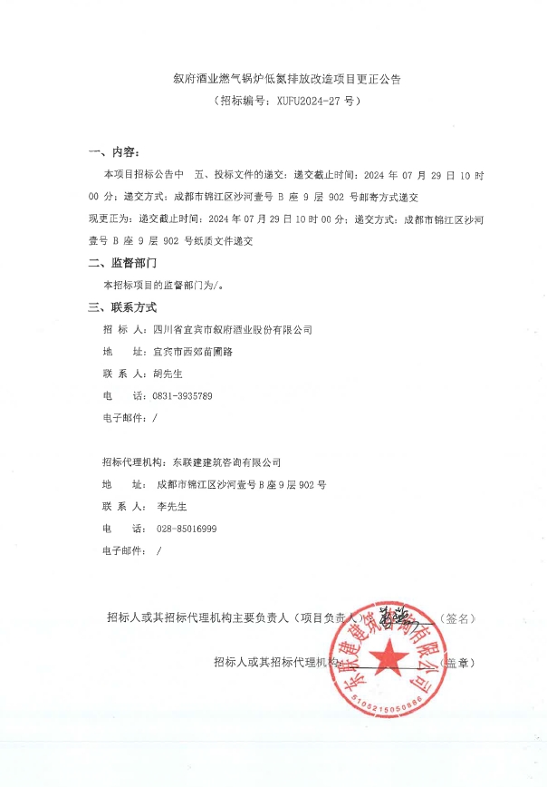 四川省宜賓市敘府酒業(yè)股份有限公司燃?xì)忮仩t低氮排放改造項(xiàng)目更正公告