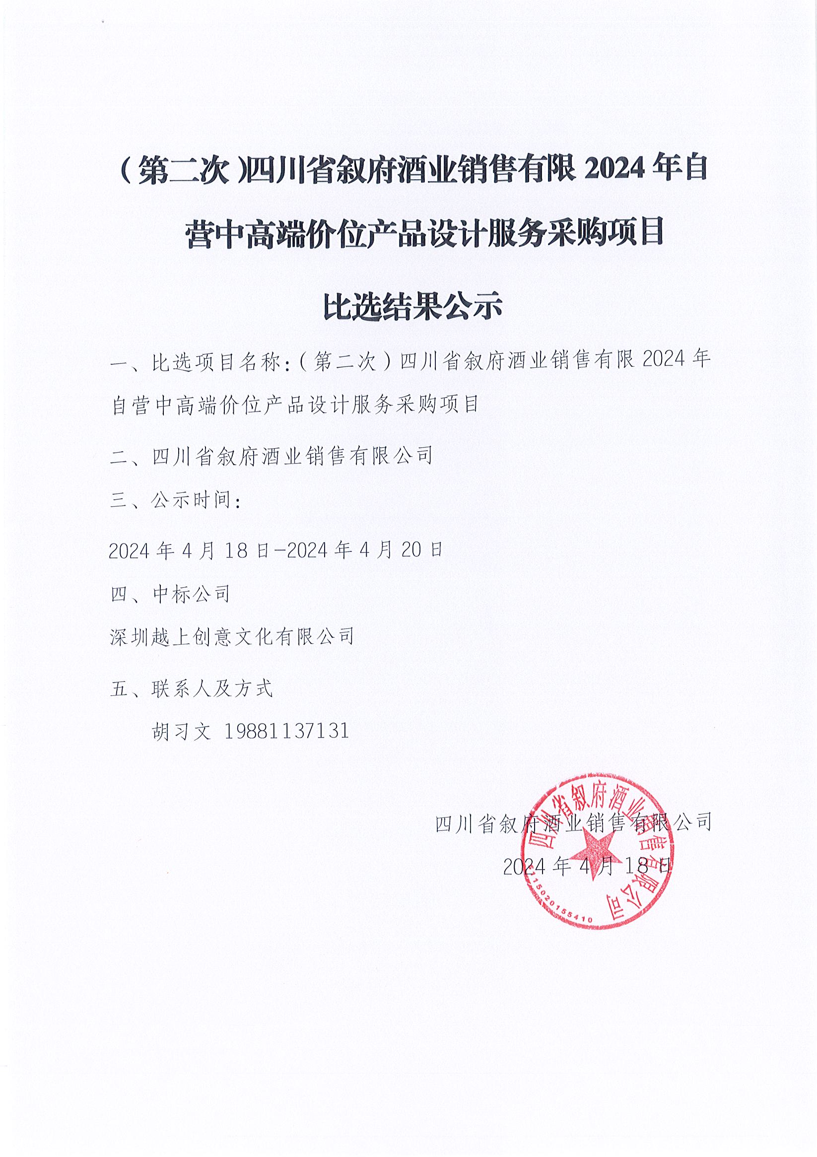 (第二次)四川省敘府酒業(yè)銷售有限公司2024年自營中高端價位產(chǎn)品設(shè)計服務(wù)采購項目中標(biāo)結(jié)果公示公告