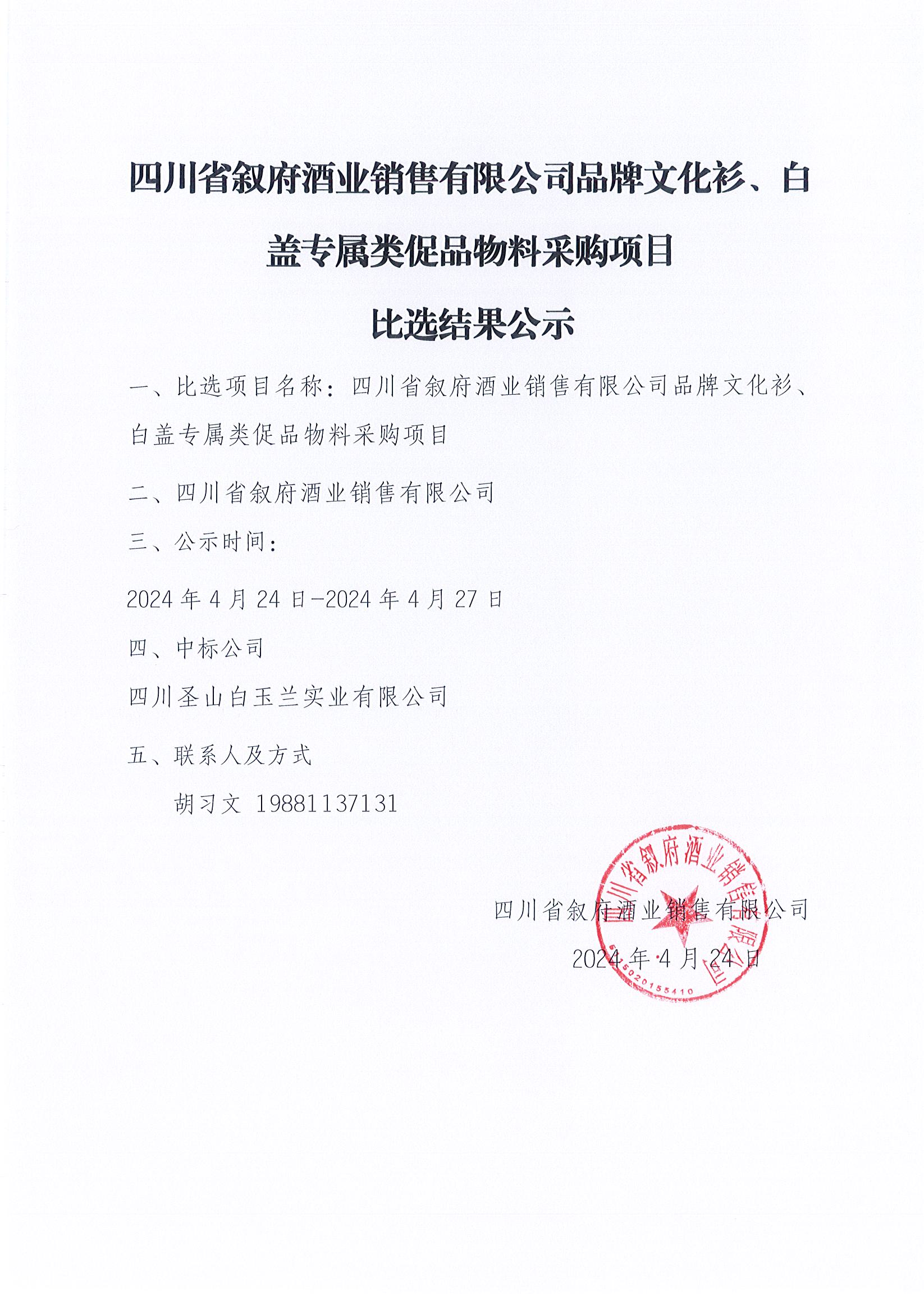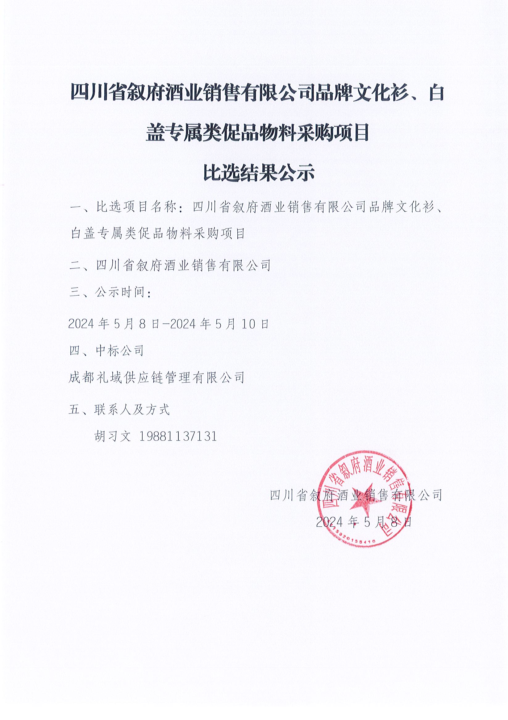 四川省敘府酒業(yè)銷售有限公司品牌文化衫、白蓋專屬類促品物料采購項目比選結(jié)果公示