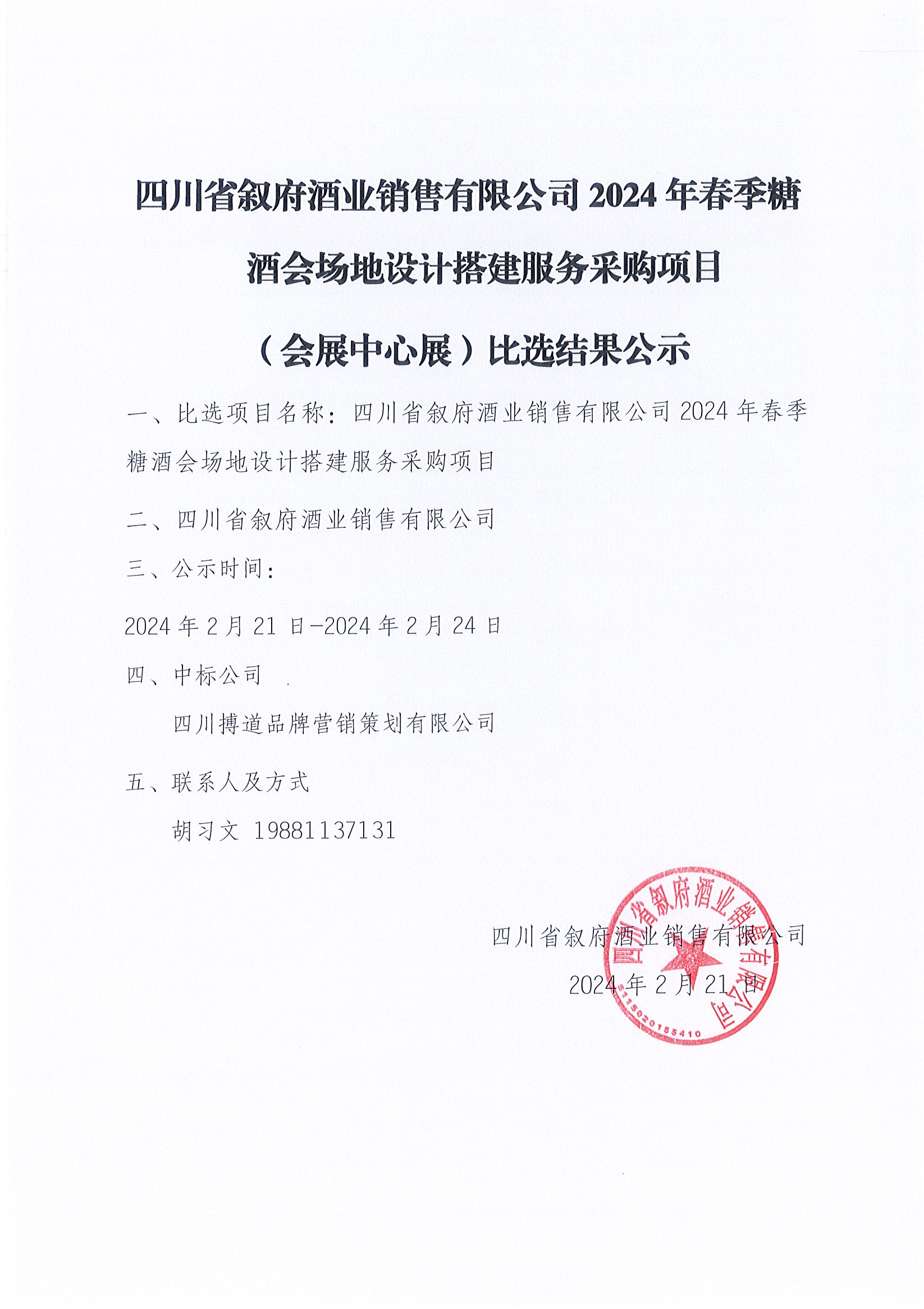 四川省敘府酒業(yè)銷售有限公司2024年春季糖酒會場地設(shè)計(jì)搭建服務(wù)采購項(xiàng)目中標(biāo)結(jié)果公示公告