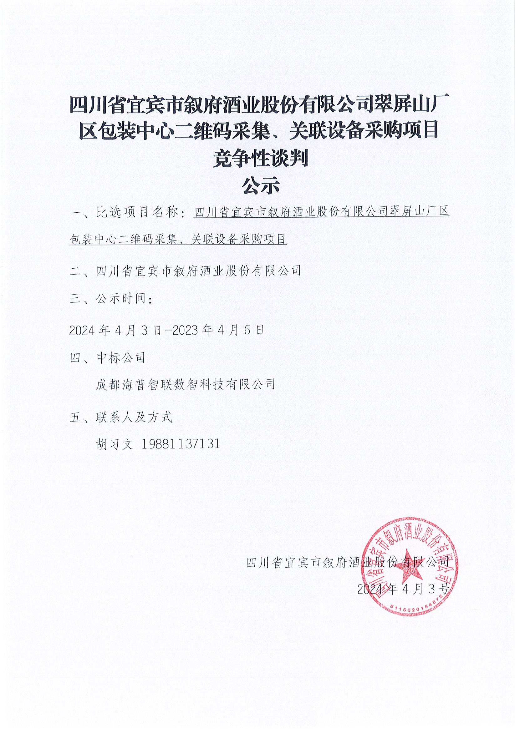 四川省宜賓市敘府酒業(yè)股份有限公司翠屏山廠區(qū)包裝中心二維碼采集、關(guān)聯(lián)設(shè)備采購項(xiàng)目中標(biāo)結(jié)果公示公告四川省宜賓市敘府酒業(yè)股份有限公司翠屏山廠區(qū)包裝中心二維碼采集、關(guān)聯(lián)設(shè)備采購項(xiàng)目公示公告