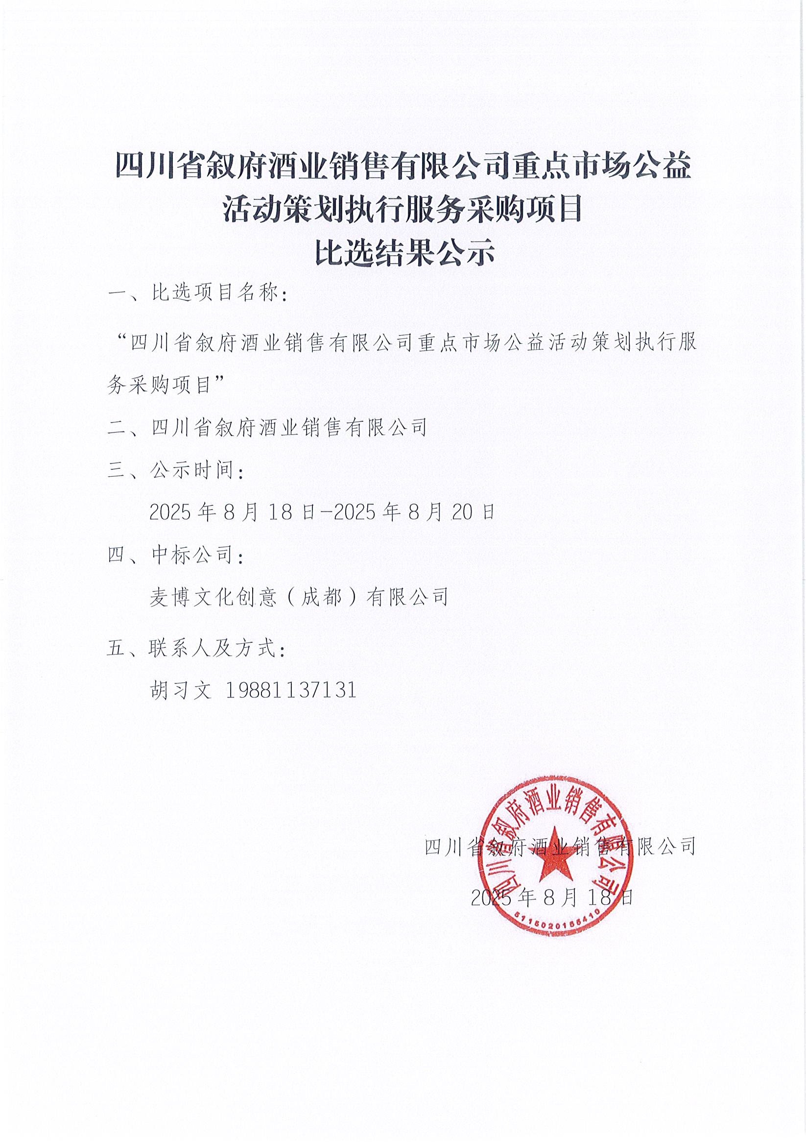 四川省敘府酒業(yè)銷售有限公司重點市場公益活動策劃執(zhí)行服務(wù)采購項目比選結(jié)果公示公告