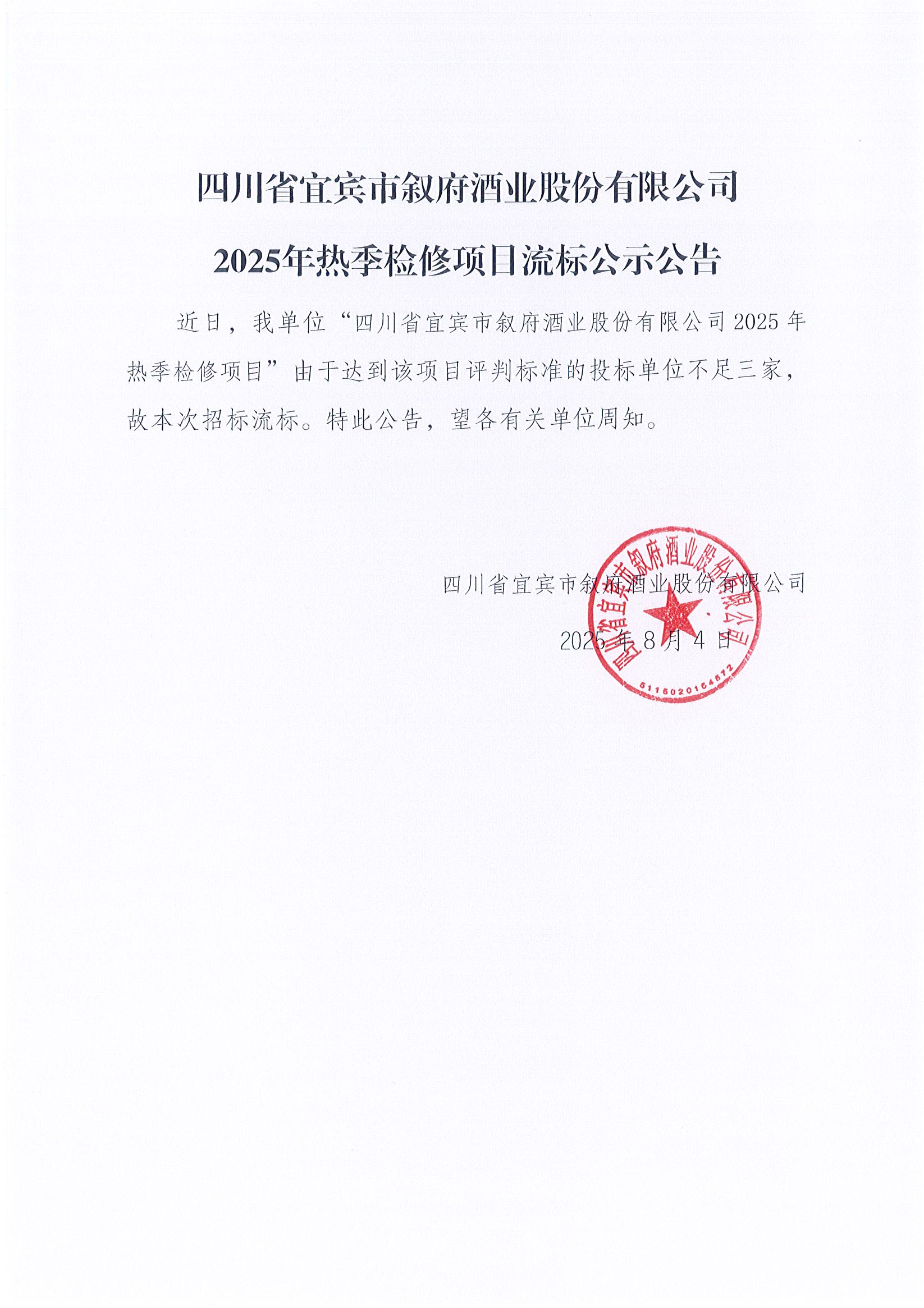 四川省宜賓市敘府酒業(yè)股份有限公司2025年熱季檢修項(xiàng)目流標(biāo)公告