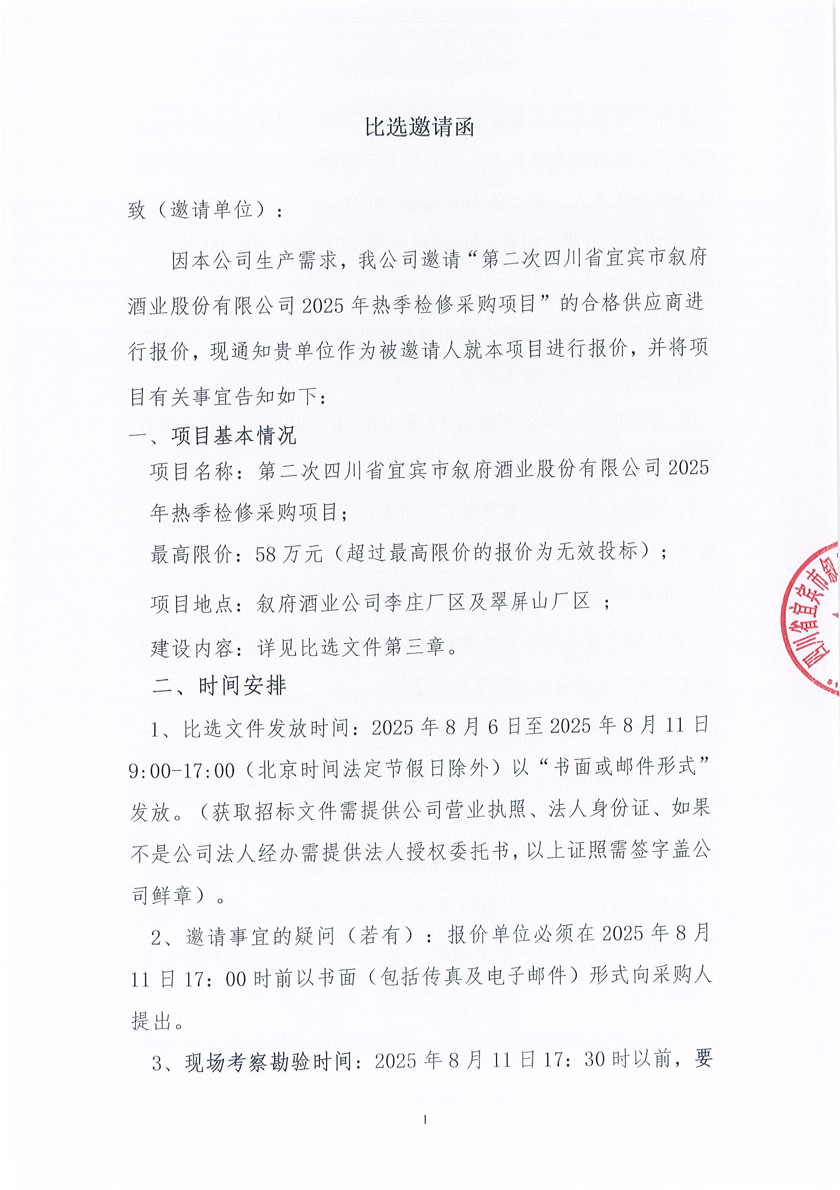 第二次四川省宜賓市敘府酒業(yè)股份有限公司2025年熱季檢修采購項(xiàng)目比選公告