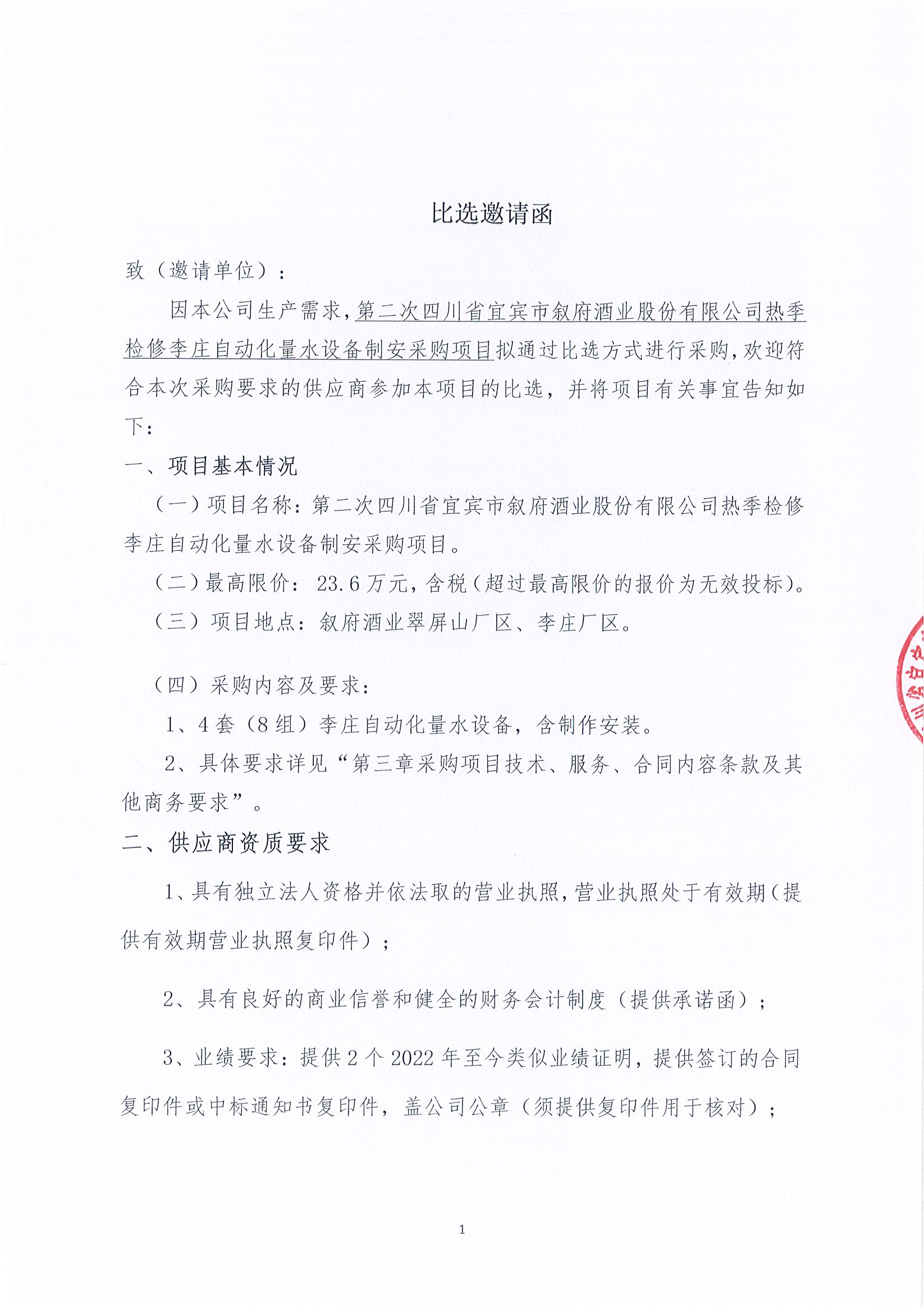 四川省宜賓市敘府酒業(yè)股份有限公司熱季檢修李莊自動(dòng)化量水設(shè)備制安采購項(xiàng)目招標(biāo)公告