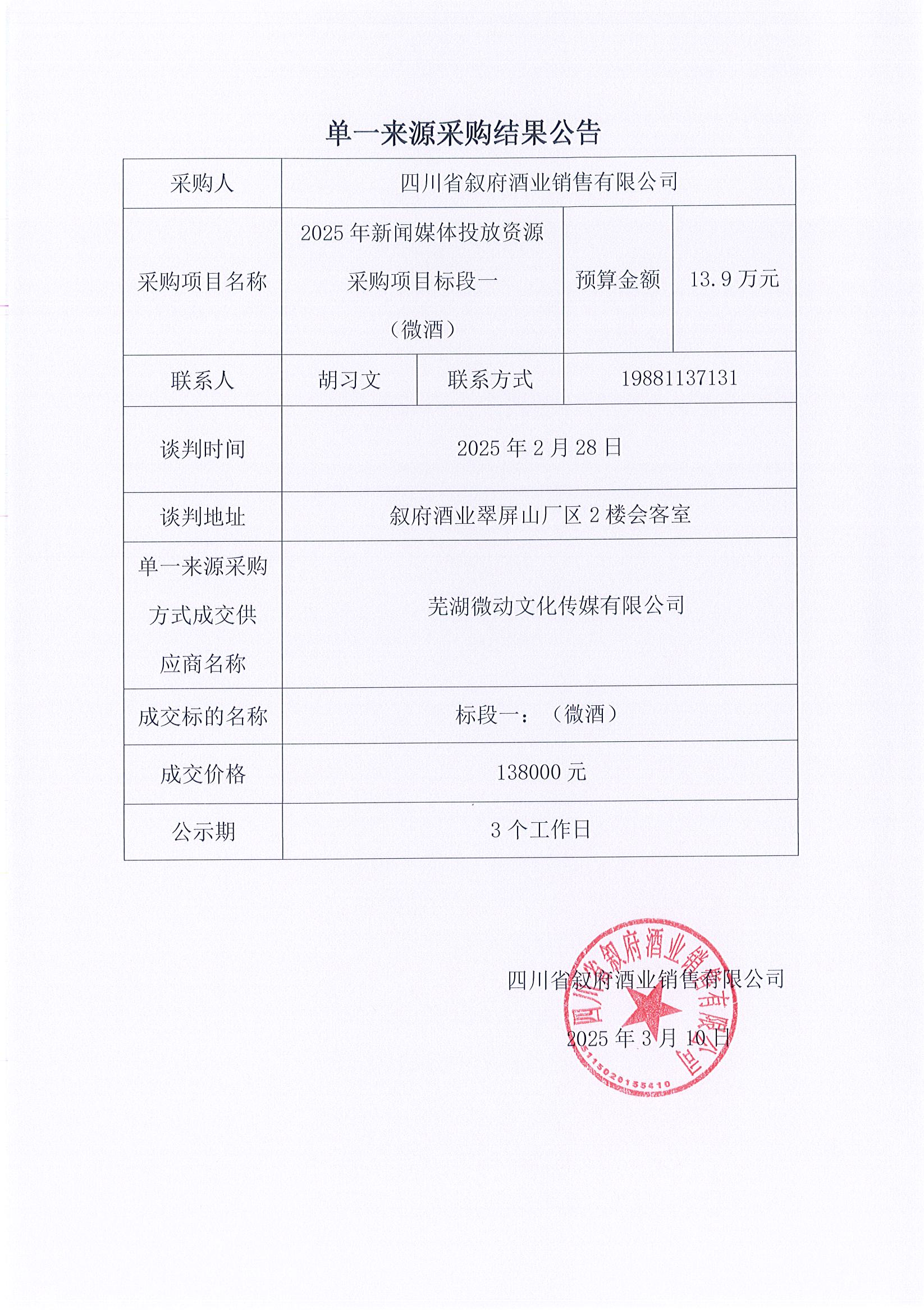 四川省敘府酒業(yè)銷(xiāo)售有限公司2025年度 新聞媒體投放資源采購(gòu)項(xiàng)目單一來(lái)源各標(biāo)段中標(biāo)結(jié)果公示公告