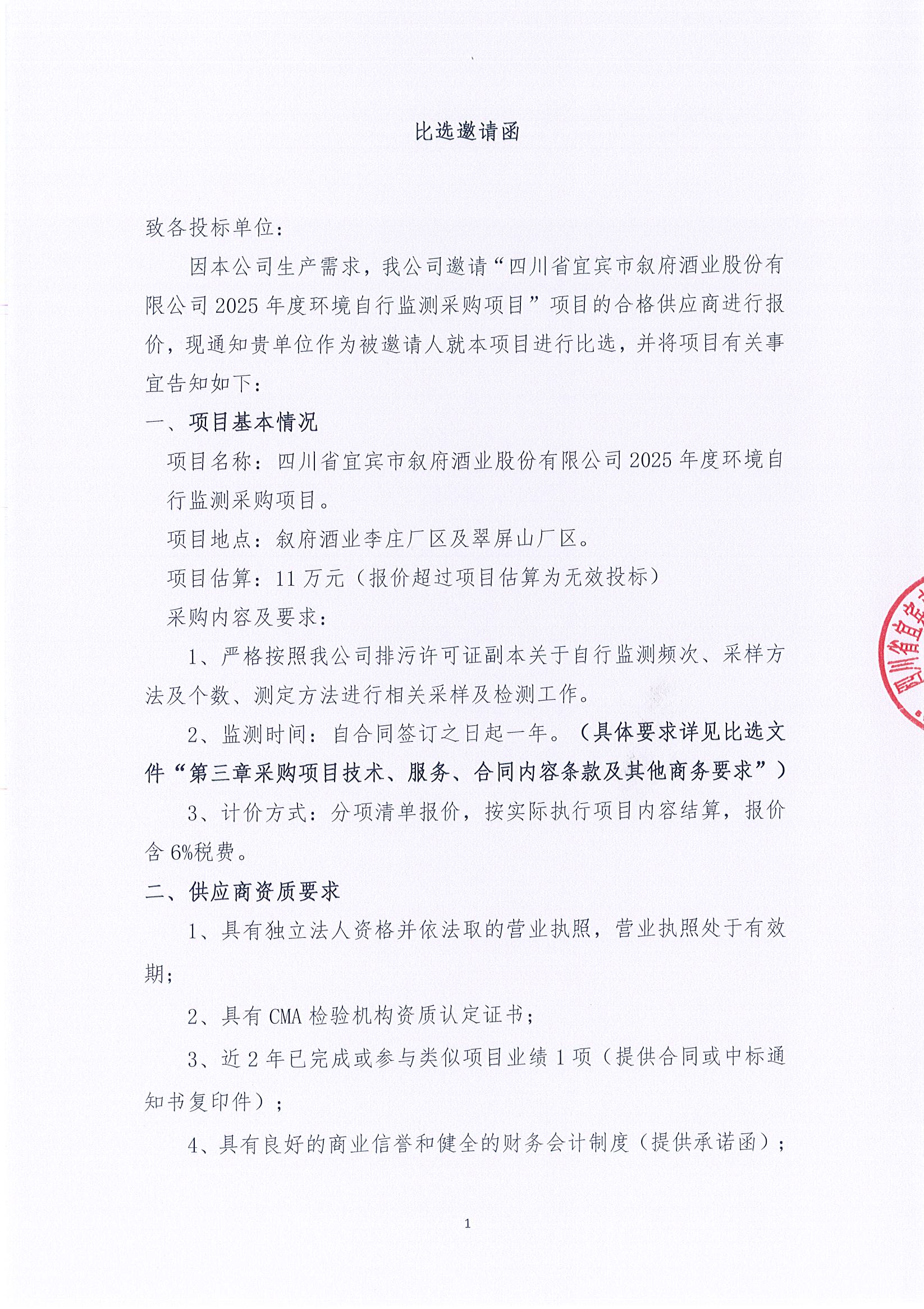 四川省宜賓市敘府酒業(yè)股份有限公司2025年度環(huán)境自行監(jiān)測(cè)采購(gòu)項(xiàng)目比選公告