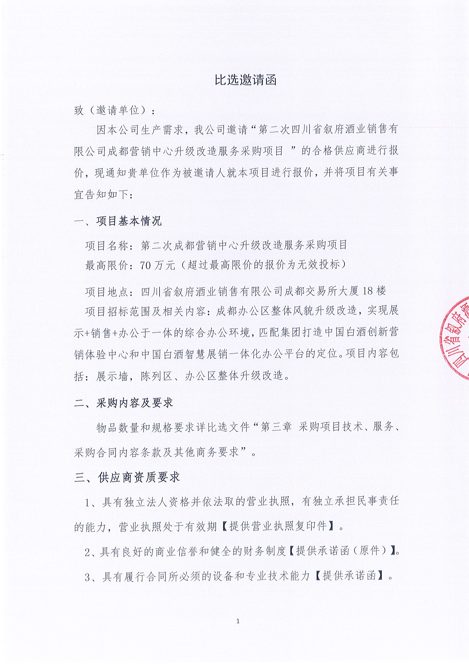 第二次四川省敘府酒業(yè)銷(xiāo)售有限公司成都營(yíng)銷(xiāo)中心升級(jí)改造服務(wù)采購(gòu)項(xiàng)目公開(kāi)比選招標(biāo)公告