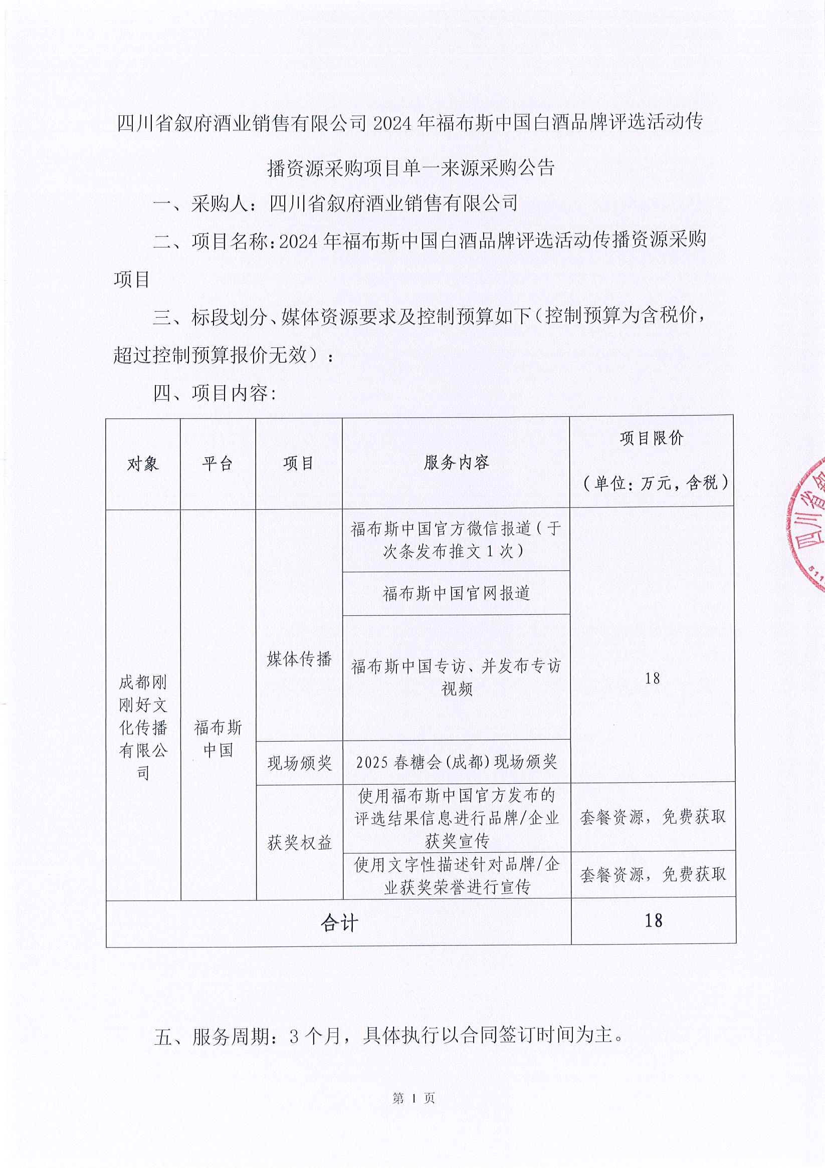 四川省敘府酒業(yè)銷(xiāo)售有限公司2024年福布斯中國(guó)白酒品牌評(píng)選活動(dòng)傳播資源采購(gòu)項(xiàng)目單一來(lái)源采購(gòu)公告